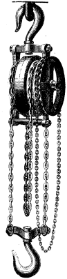 "The block is made on the differential principle. The lifting chain is passed over two sheaves, each of which is geared internally, the one having one or more teeth in excess of the other. Revolving around these internal teeth is a pinion, actuated by an eccentric, which is keyed on to a shaft passing through the center of the block, with a bearing at each end in the outside frame of the block. At one end of this shaft is a wheel with an endless hand chain passing over it; this gives the motion to the eccentric shaft. The teeth of the internal pinion are broad enough to gear into the teeth of both the sheaves, but as there is more teeth in one than in the other, they (the teeth) are not exactly opposite each other, and therefore will not admit the teeth of the revolving pinion without moving; but the tooth of the pinion, acting as a wedge, and entering with great power, pushes the one tooth forward and the other tooth back; and this continually occurring, a continual rotary motion is given to the sheaves, in opposite directions, with a power which is proportioned to the number of the teeth, the throw of eccentric, and the leverage gained by the diameter of the hand wheel. The lifting chain is passed over the one sheave, then down, and up over the other, the two ends being attached to a powerful cross bar, to which is connected the lifting hook. By this means the weight is distributed over the two sheaves and the two parts of the chain, increasing the safety and diminishing the friction of the block.