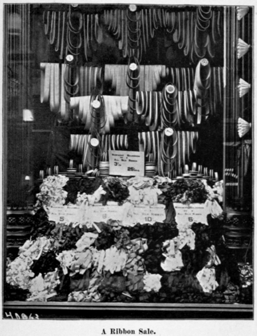 There is no line of goods carried in a dry goods stock that is more diversified in color, widths and general effects than are ribbons. A very striking window can be made by constructing of light boards a framework six feet square, or of any size which will best fill your window. Across this may be drawn ribbons of various widths and colors in such order as will make a solid wall of color, forming a handsome and attractive show-card. The loose ends may be pinned to the frame and the uncut ends so fixed as to stay in position and still not require cutting or separation from the roll. The preparation of this window will give tasteful young saleswomen a good opportunity to display their skill. If desired, other contrasting colored ribbons may be interlaced at right angles, or a little ingenuity will be rewarded by the designing of a number of beautiful geometrical figures. A very showy window can also be arranged by the use of different colored ribbons by interlacing and weaving them in such a manner as to produce a perfect checkerboard.