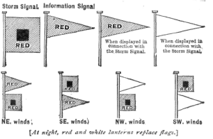 Along the seacoasts and on the Great Lakes the following flags signify the approach of dangerous winds :