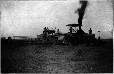The New Way. A modern combined reaper and thresher, drawn by a traction engine. Here the grain is cut, threshed and delivered in sacks as the machine moves along.