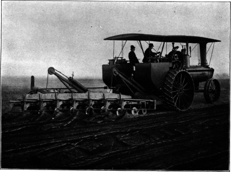 The New Way. A modern gang plow drawn by a traction engine and turning eight furrows at a time.