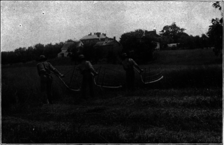 The Old Way. These men are cutting the wheat with cradles. It is then raked into bundles which are bound by hand and gathered into shocks. Later they are hauled on wagons to a threshing machine and threshed, the grain being thus separated from the straw.