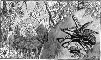 But she makes such a pretty house that you feel like going anyhow. It's a gossamer wheel of a curtain. You can find it in almost any garden, stretched across a fence corner, or between the low branches of stout shrubs. You won't often see the little gray and brown mistress of it. That house is merely a sun-parlor of a net, spread in the open for the unwary fly. The lady of the house is of such a retiring nature that she prefers to live in a dark tunnel den behind the parlor. Stand out of sight—and remember Madame has from two to eight eyes in her head, and can see all around the compass—and fling a bit of dry leaf on the web. She darts out. She views that leaf with disgust, thinking the wind has played a trick on her. Very likely she will push it overboard, for she keeps her house clean and shining.