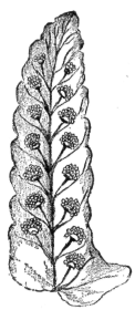 Find a fern leaf that is fully grown, in some shady spot in the woods. All around the edges of the underside, you will find little rusty spots. These are very regularly spaced, so you can easily guess there is some plan. If you look at them through a microscope you will see that they all grow from the ends of the veins, and are connected with the mid-ribs of the leaflet, and those mid-ribs with the main stem. (See Filicales, Volume II, page 661.) So all those little rusty spots are fed from the root in the ground. The rust spots are only tiny, pin-head grains, that look like a brown powder. But you will find them fastened tight. The microscope shows them to be little brown cases, filled with still smaller grains. These are spores, like those on the liver-wort and moss. Around each spore case is hung a necklace of crystal beads. These draw together, tighter and tighter, until they force the spore case to burst open, and shoot out the ripe spores.