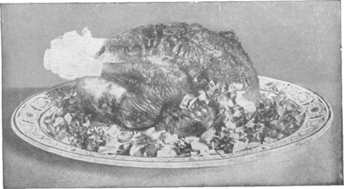 Remove tendons from the legs, singe and draw the turkey; remove pin feathers, wash and dry carefully; fill with stuffing if desired; cover the breast with thin slices of salt pork, scored lightly and fastened in place with strings or small skewers, and set on the rack of a baking pan into a hot oven. Turn the bird often that the heat may sear over the outside uniformly and thus keep the juices within. When this has been accomplished that is, in about fifteen to thirty minutes, add a little hot water and drippings to the pan, and as soon as possible reduce the temperature to that of ordinary baking. Baste every ten minutes, dredging with flour after each basting. When half cooked add salt to the flour. When the joints will separate easily the cooking is completed. Three hours are required to roast a ten-pound turkey. When the fowl is nearly cooked, remove the pork from the breast, baste with a little butter melted in hot water and return to the oven for final browning; baste several times or until the desired color is attained Garnish with water cress, cover the ends of the drum sticks with paper frills. Serve, at the same time, Giblet Sauce made of the browned flour in the pan, additional flour if needed, the water in which the giblets were cooked, and the giblets chopped, but not too fine. In America cranberry sauce accompanies this roast; in England gooseberry sauce is in evidence.